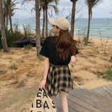 Entdecken Sie den rebellischen und nostalgischen Charme unseres Rock- und Oberteil-Ensembles, das perfekt für alle ist, die es lieben, Unbeschwertheit mit einem Hauch von Kühnheit zu verbinden. Das kurzärmelige schwarze T-Shirt mit einem niedlichen Teddybären in einem T-Shirt mit Zahlen spiegelt einen jungen, verspielten Stil wider. Die sanfte Anspielung auf die Kindheit wird durch die Eleganz eines karierten Rocks in Braun- und Schwarztönen ausgeglichen, der an Schottenmuster erinnert und für einen Hauch klassischer Alternative sorgt. Der Faltenrock bietet Bewegungsfreiheit und suggeriert gleichzeitig eine verspielte Silhouette. Er wird in der Taille mit einer subtilen Schleife befestigt, die die Form sanft betont. Er ist aus einem leichten, weichen Material gefertigt und begleitet jeden Schritt mit Leichtigkeit. Das T-Shirt hingegen verspricht dank des weichen Stoffes und des legeren Schnitts absoluten Komfort.