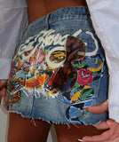 Y2K Streetwear Jeansrock aus blauem Denim mit Hip Hop-Aufdruck